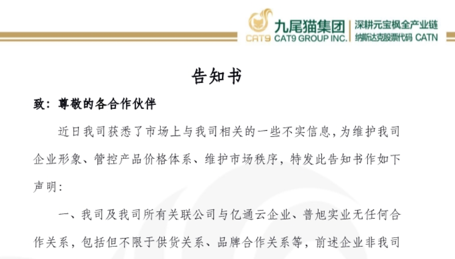 公告 为了保护广大九尾猫股东、代理商及客户利益,确保大家资金安全,特发此公告如下 : 1.公司项目均会有九尾猫实业盖章的项目书,并以官方网站(http://www.cat9.cc)、公众号(Cat...