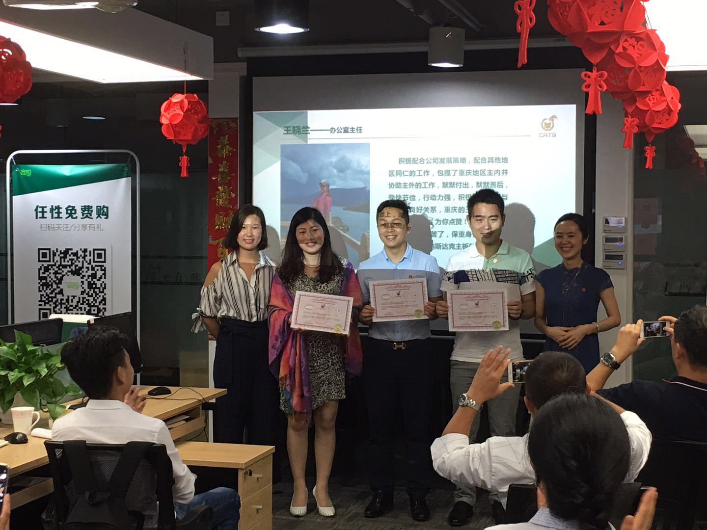 分享结束紧接隆重的股权确权仪式,以表彰一路跟随公司成长,兢兢业业、任劳任怨的三位同事:重庆分公司总经理佘秋林、营销经理史易谦,办公室主任王晓兰。伴随着掌声和喝彩声,易总等公司领导向这三位同事颁发了九尾猫集团股权证,感谢以这三位同事为榜样的九尾猫人大家庭始终不离不弃、一路相随,从一颗种子不惧风雨茁壮成长为参天大树。