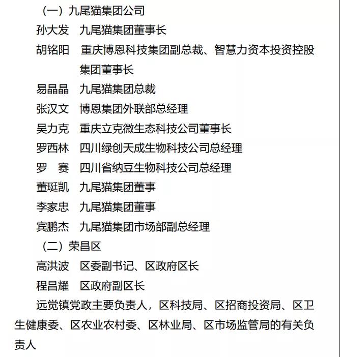 2020 年6月23日(星期二)下午 16︰30,九尾猫集团会同荣昌区政府于荣昌区人民政府行政中心召开了“乡村振兴一二三产业融合九尾猫模版”六月工作成果交流、沟通座谈会议。区委副书记、区政府区长高洪波,区政府副区长程昌耀;九尾猫集团董事长孙大发,九尾猫集团总裁易晶晶等均出席本次会议。本次会议与会人员详细名录如下: